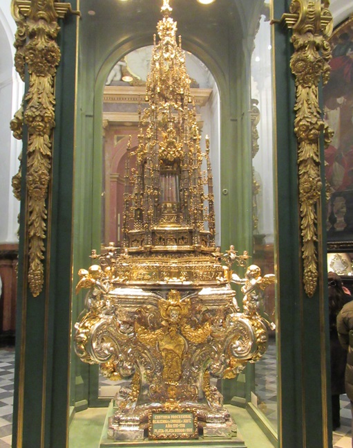サンタテレサ礼拝堂は聖具室(宝物室)として利用されており、中央には金と銀の豪華な聖体顕示台が展示されています。高さ約3m、重さ約200㎏。
