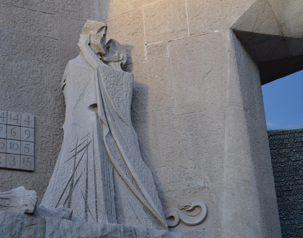 複音の扉の前にイエス=キリストが柱にくくられ鞭打ちの刑をうけている像があります。ガウディは、壁から離した場所に置くことにより、教会に出入りする人が必ず観るようにと考えたそうです。