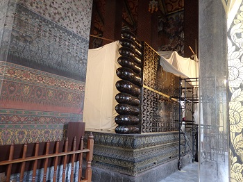 足の裏ただいま修理中。幅5m、高さ3m偏平足です。これまたとても大きいです。 足の裏には真珠貝を使って螺鈿細工(らでんざいく)で描かれた108の絵があります 「モンコイロンベート」と言われるもので人々に幸福をもたらすというそうです。