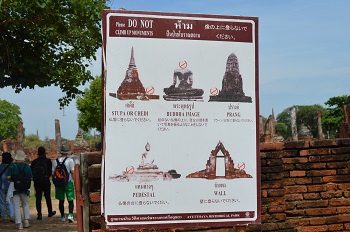 観光客用にタイ語・英語・日本語で書かれている注意書きがあります。顔のない仏像の上に自分の顔を置いて写真を撮る人がいるんでしょうか? ここまでしないと守れない方が多いのでしょうね。