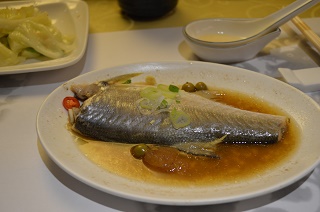 料理の写真・台湾近郊の淡水で捕れたお魚(すずき)かな?、中華風鮮魚の蒸し料理。あさりとした味わいです