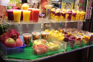 お祭りの屋台みたいで見ているだけで楽しいですね。果物が売られています。
