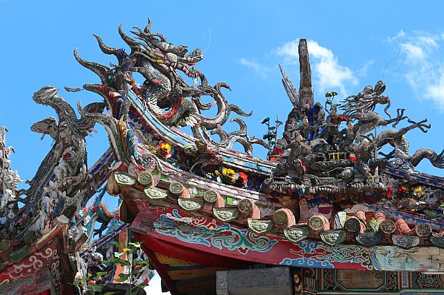 いたるところに彫刻が施されていますが、特に屋根の部分は龍や鳳凰などカラフルな彫刻は見どころがあります。